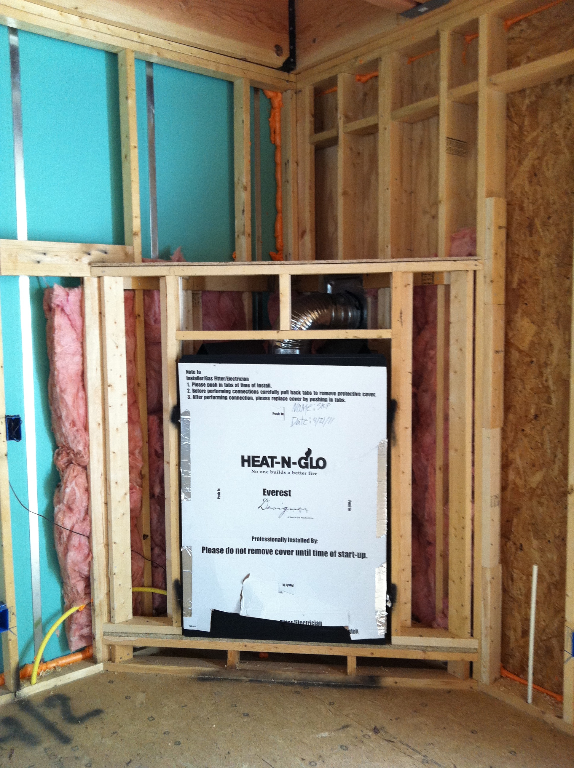 Even though these homes are intended to be showcases of green and energy efficient features they too had areas that could be improved. The homes under construction were lacking air barrier on the interior side of the insulated fireplace chase walls (Figure 2). Although this requirement that vertical insulation is completely enclosed on all six sides is actually a Version 2 requirement, it proves to still be problematic. The Rater informed us that the builder recently switched fireplace installers and this would be remedied.